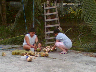 Just wanna share with all. Here are some pictures of my youngest sister, Nurul, and youngest brother, Azri, when they were outside the house collecting some coconut juice. We have lots of them and today Nurul and Bahri, my other brother, wanted to have some for sungkai. Poor Nurul and Azri had to do all the peeling while Bahri was out of sight! Hehehe :p