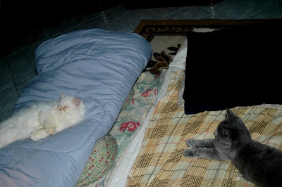The first meet, Whiny was freaking out! LOL! He'd shriek (can't find the right word for cat's action: we actually call it "Whiny's vampirish act!" hehe) every time we put him next to Fluffy. Fluffy on the other hand, was such a cool cat! She'd just stare at Whiny, unaffected by him! She posted her radiant posture, ignoring him. At first, Sharul and I wondered, would this cold war last long? Whiny seemed to have hated her!